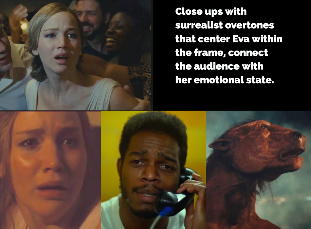 Close ups that center Eva within the frame, connect the audience with her emotional state.